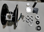 气动隔膜泵配气阀安装视频材料:5个滑阀圈垫 1个滑阀垫圈 ,4个轴隔,6个大O型圈,5个小O型圈步骤:先把4个滑阀小O型圈分别嵌到4 个轴隔里,这样子套好。然后开始安装:第一、先装这个滑阀圈垫,有字的这面朝下放进去,接着放入滑阀大O型圈,然后放入轴隔,轴隔平的这面朝下,带四个脚架的这面朝上,然后继续重复前面的步骤:滑阀圈垫、 大O型圈 、轴隔 ,四套均按这样顺序逐个放进去。第二、接下来把第5个滑阀