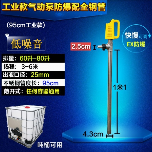 气动油桶泵是一种利用压缩空气作为动力源的液体泵,其工作原理是将压缩空气通过气动马达转换为机械能,驱动活塞往复运动,从而将液体吸入泵体内,再通过出口管道将液体输送到需要的地方。由于气动油桶泵采用的是压缩空气作为动力源,所以其工作时噪音低、振动小、能耗低,同时也能够适应不同粘度的液体。